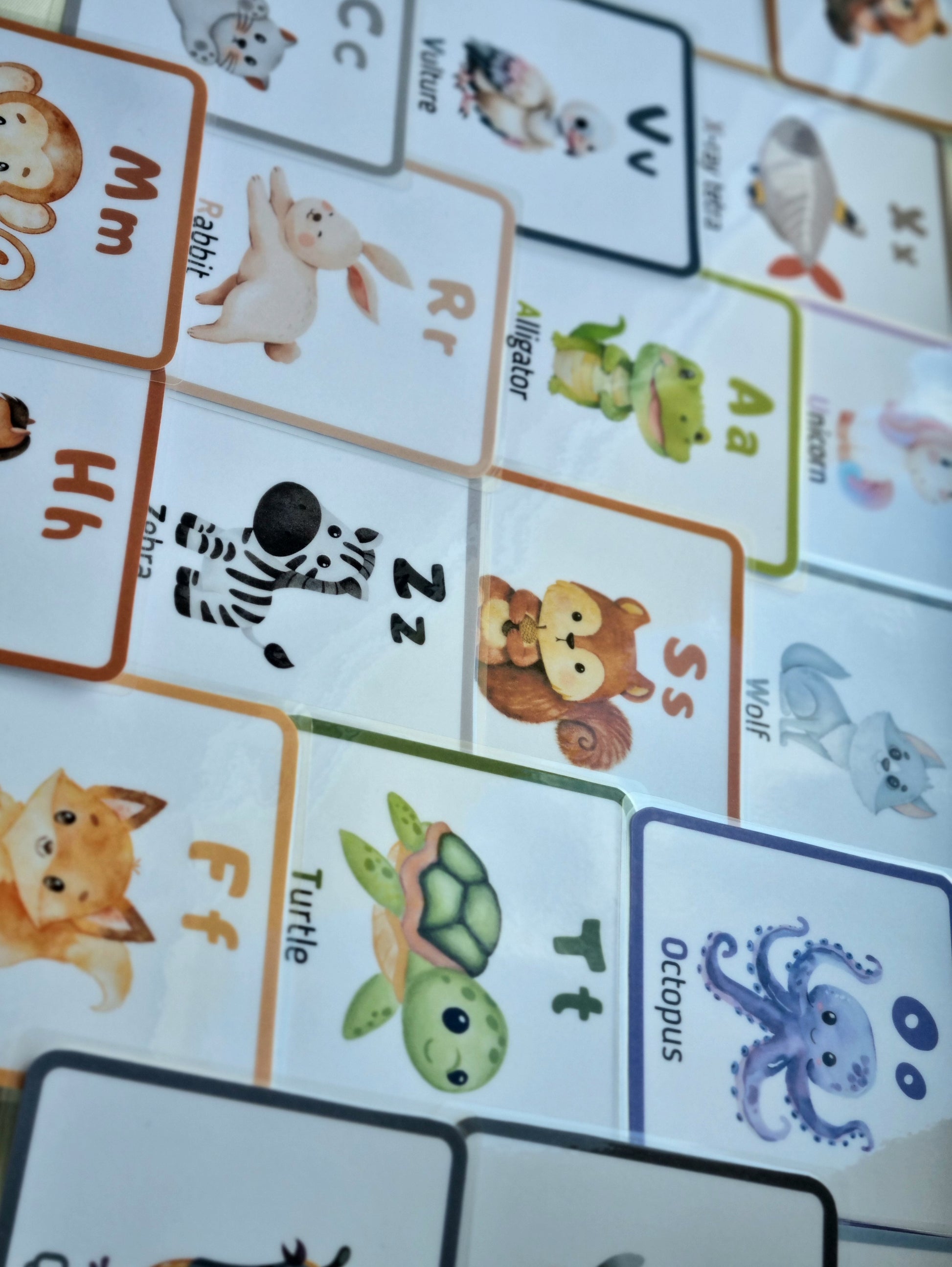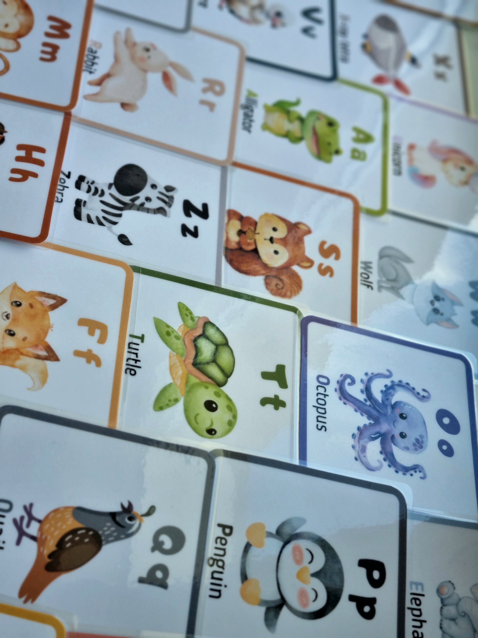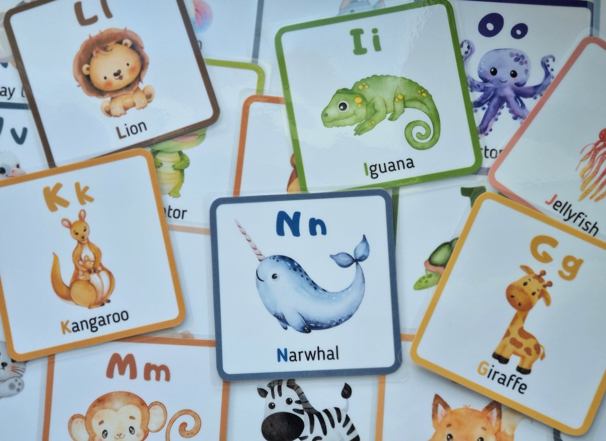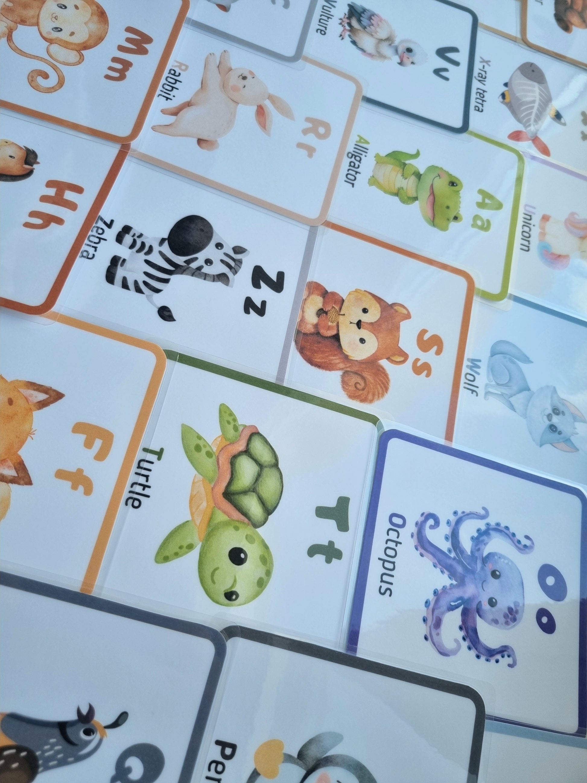 Spalvingos, laminuotos 10×10 cm kortelės su raidėmis ir mielais gyvūnais padės vaikams smagiai mokytis angliškų žodžių ir raidžių garsų atpažinimo.