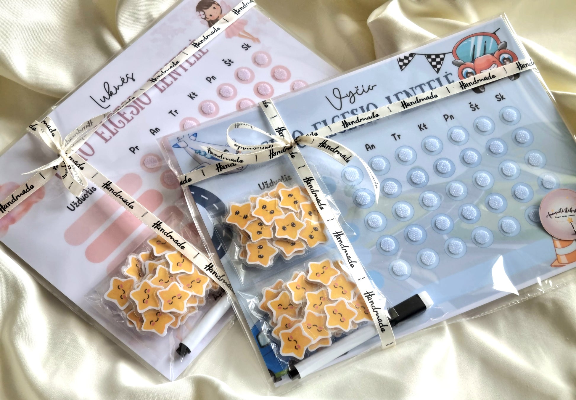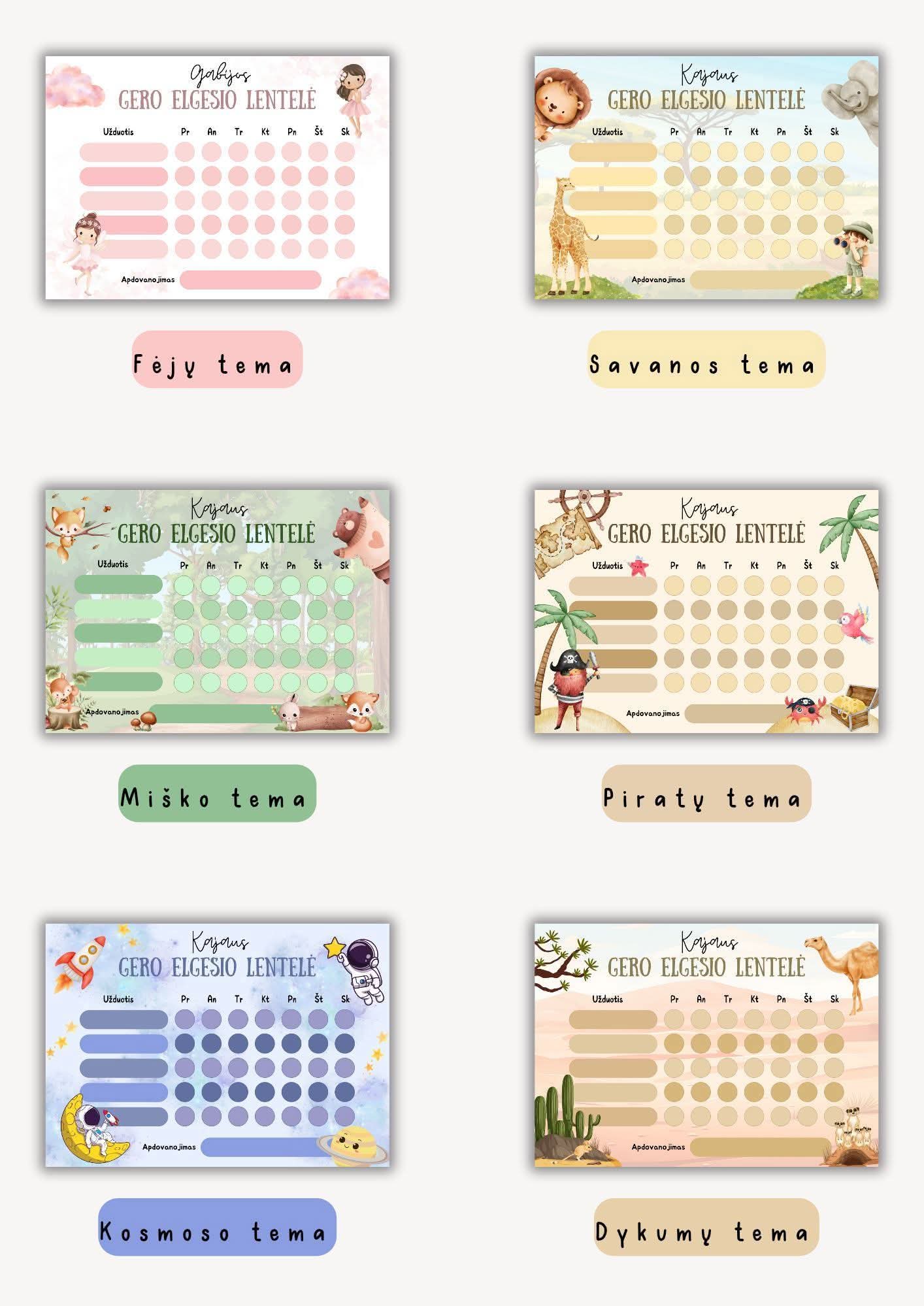 Ši personalizuota gero elgesio lentelė padeda vaikui suprasti pastangų ir atlygio ryšį – pažymint, kaip sekėsi kiekvieną dieną. Tėvai gali patys užrašyti veiklas, tikslus ar pareigas su pridedamu sauso valymo žymekliu – todėl lentelę galima naudoti vėl ir vėl!