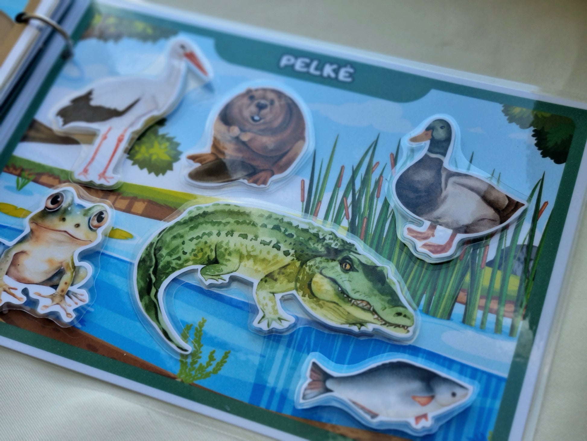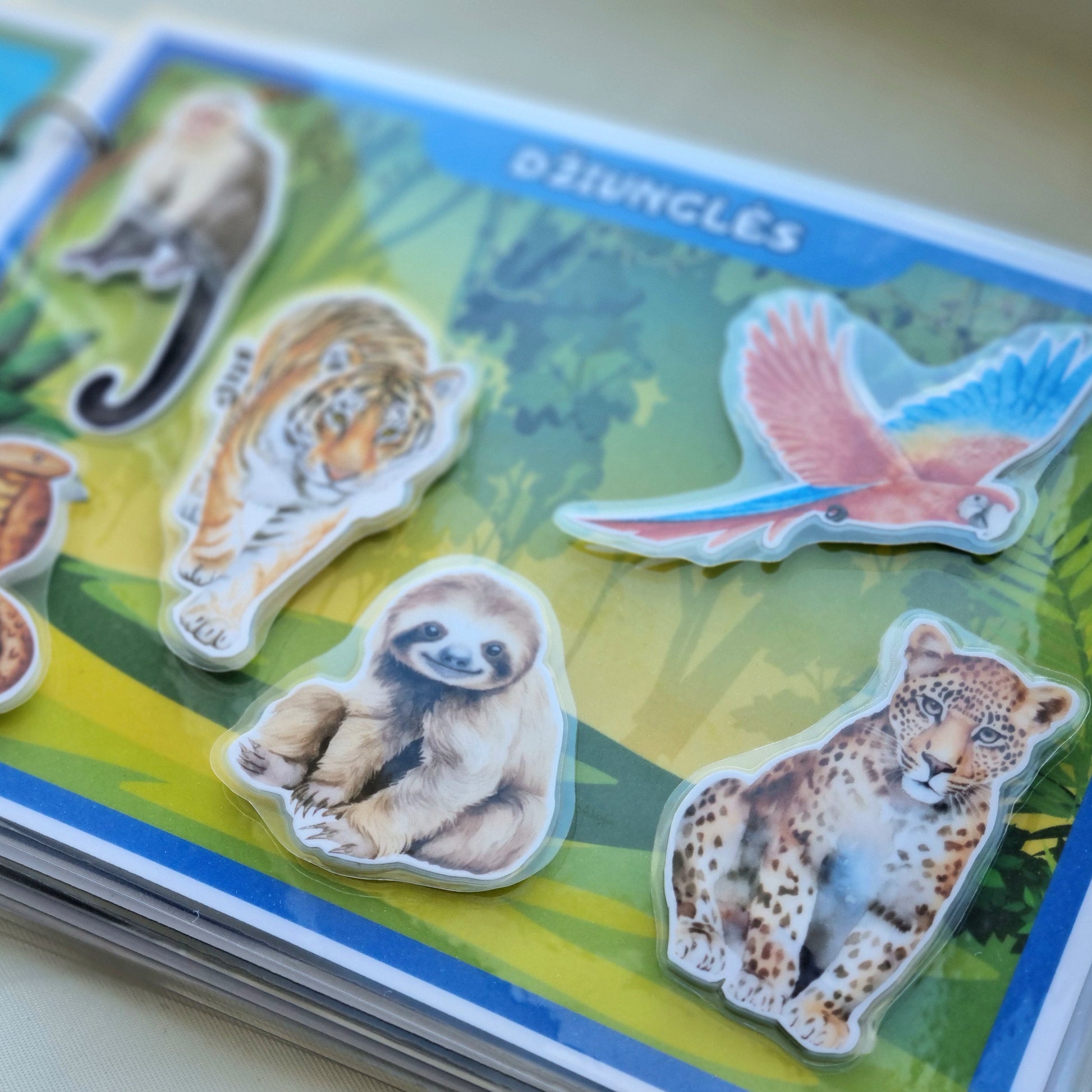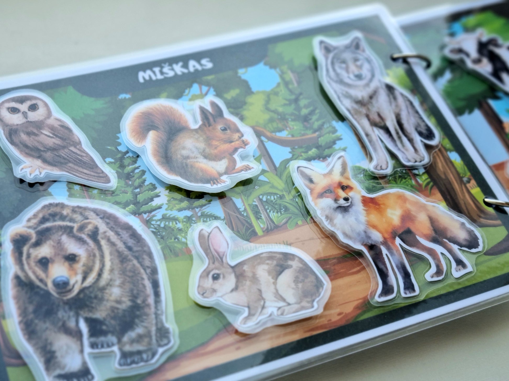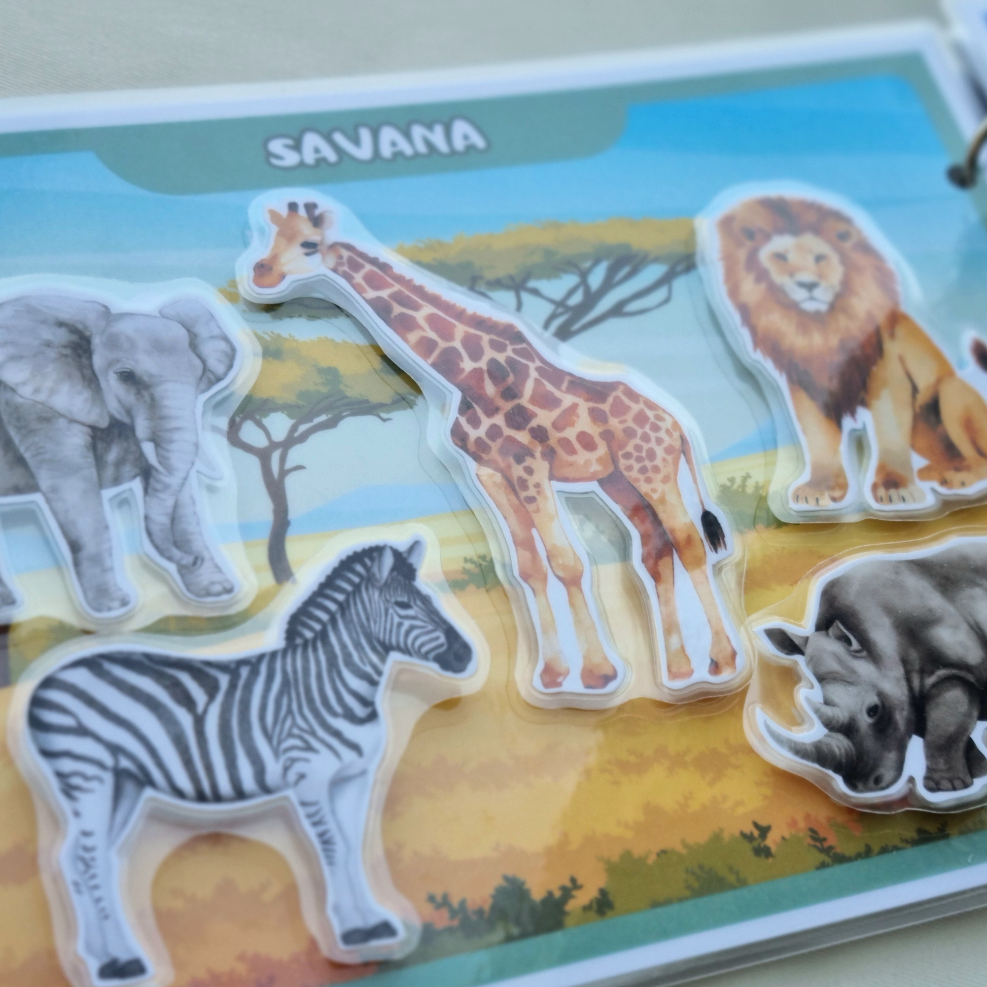 Ši laminuota knygelė su daugkartiniais lipdukais leidžia vaikui keliauti po mišką, džiungles, vandenyną, Arktį, savaną ir kitas vietas, pažįstant skirtingus gyvūnus žaismingu būdu.