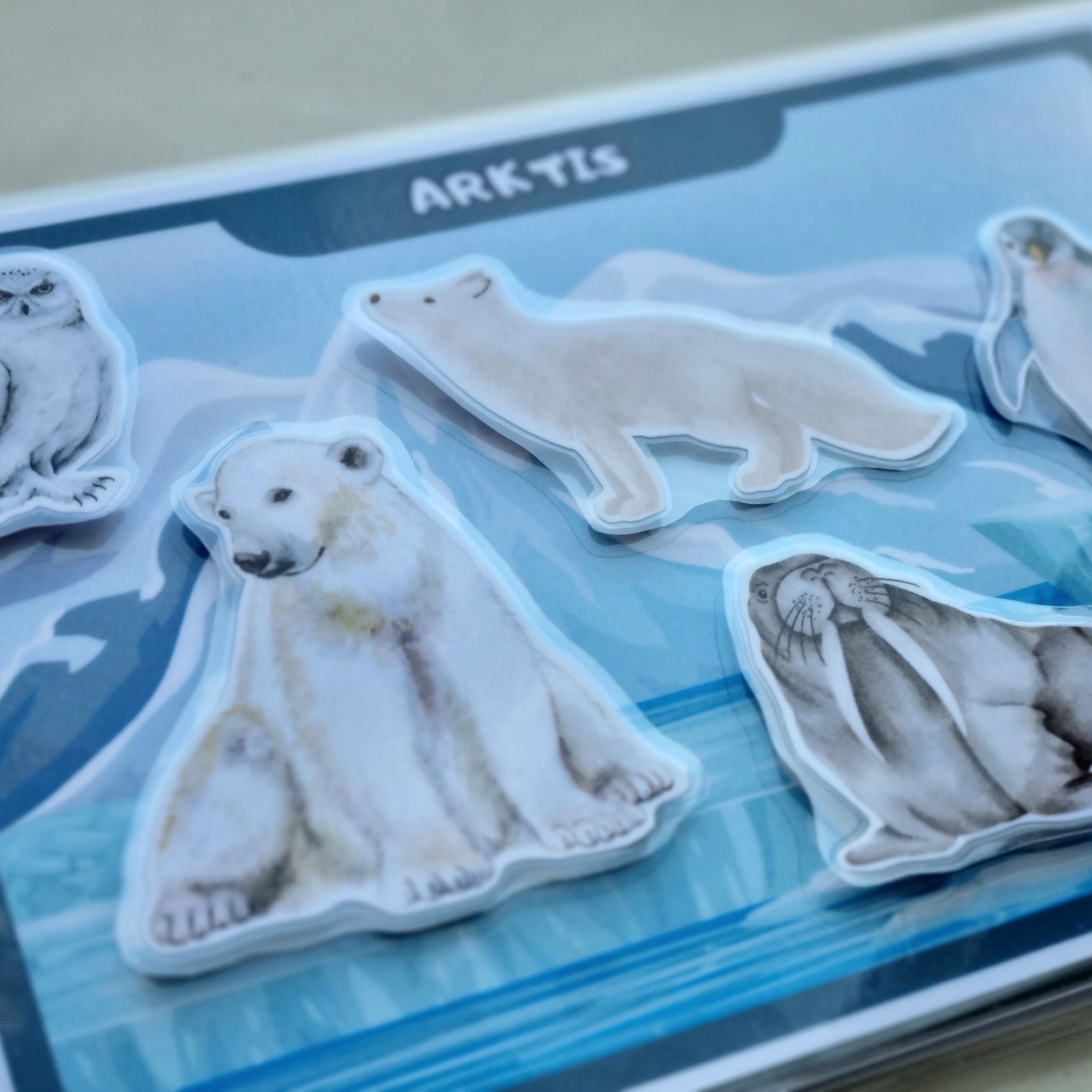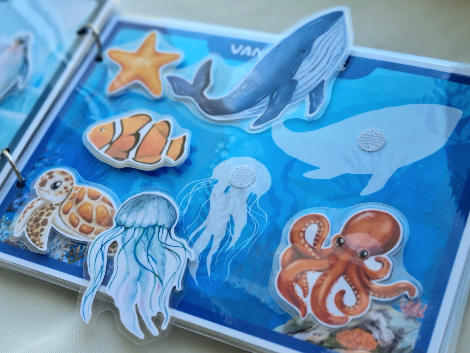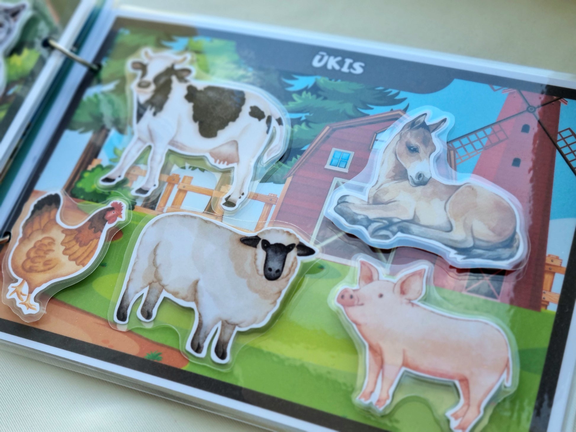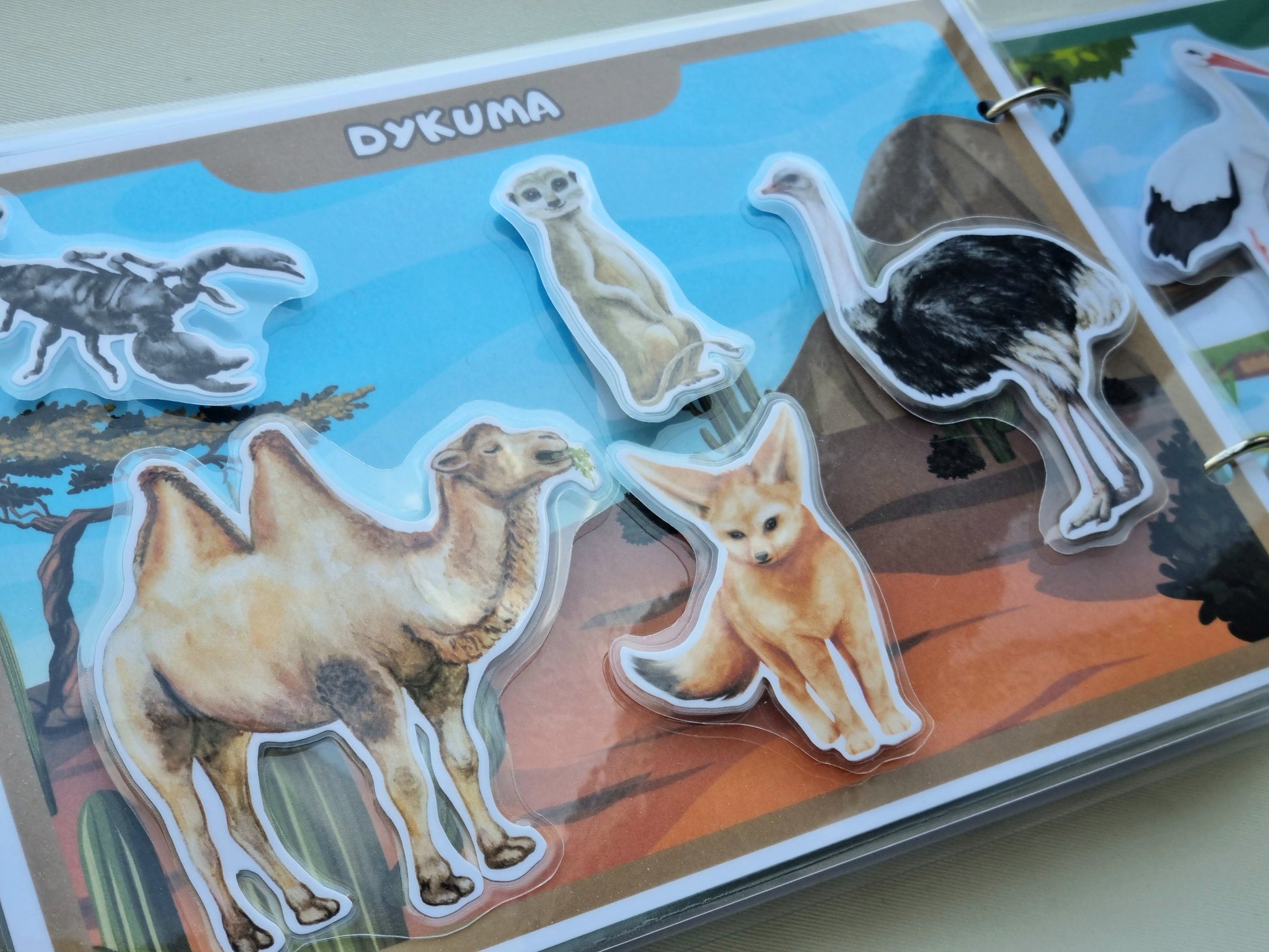 Ši laminuota knygelė su daugkartiniais lipdukais leidžia vaikui keliauti po mišką, džiungles, vandenyną, Arktį, savaną ir kitas vietas, pažįstant skirtingus gyvūnus žaismingu būdu.