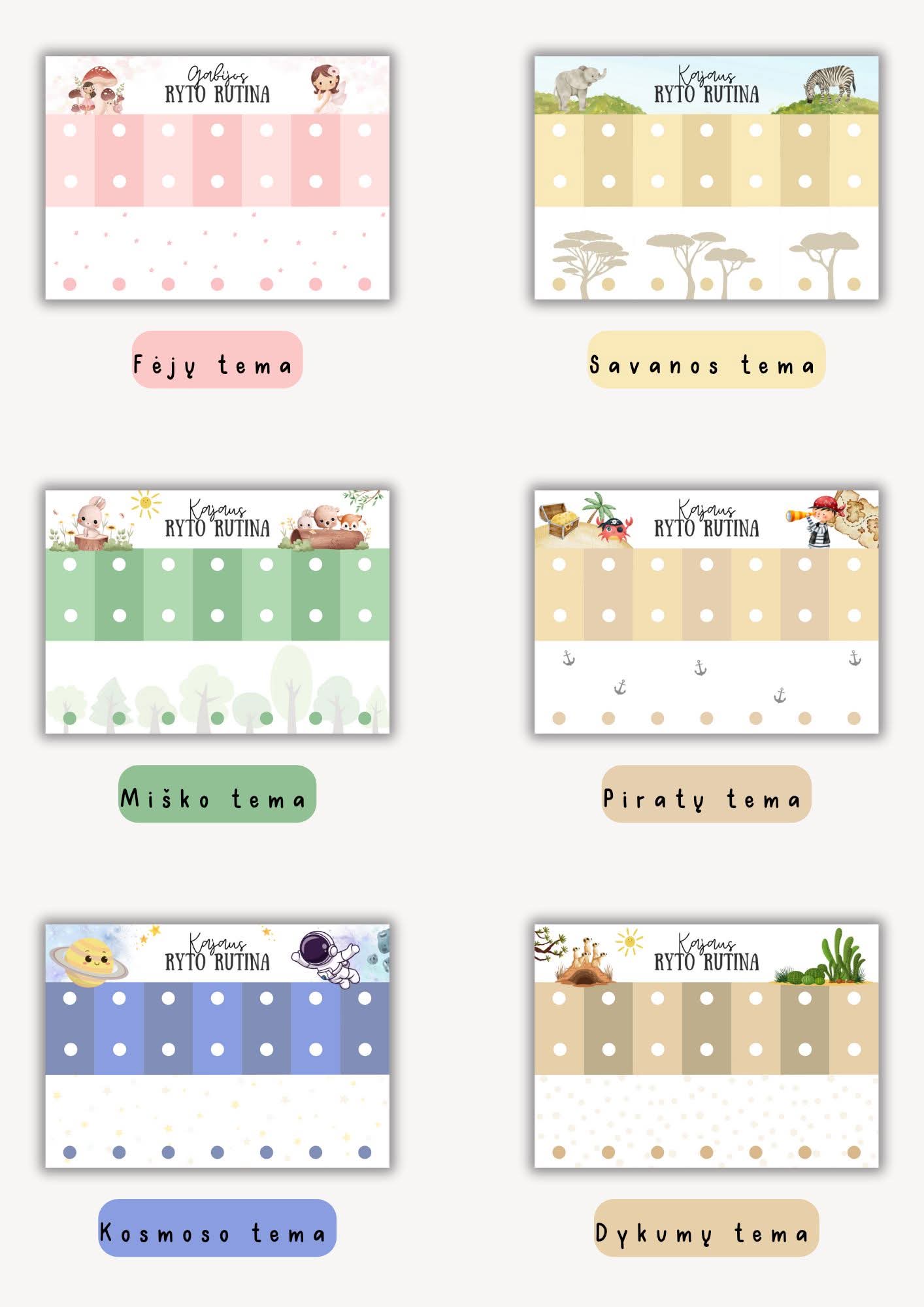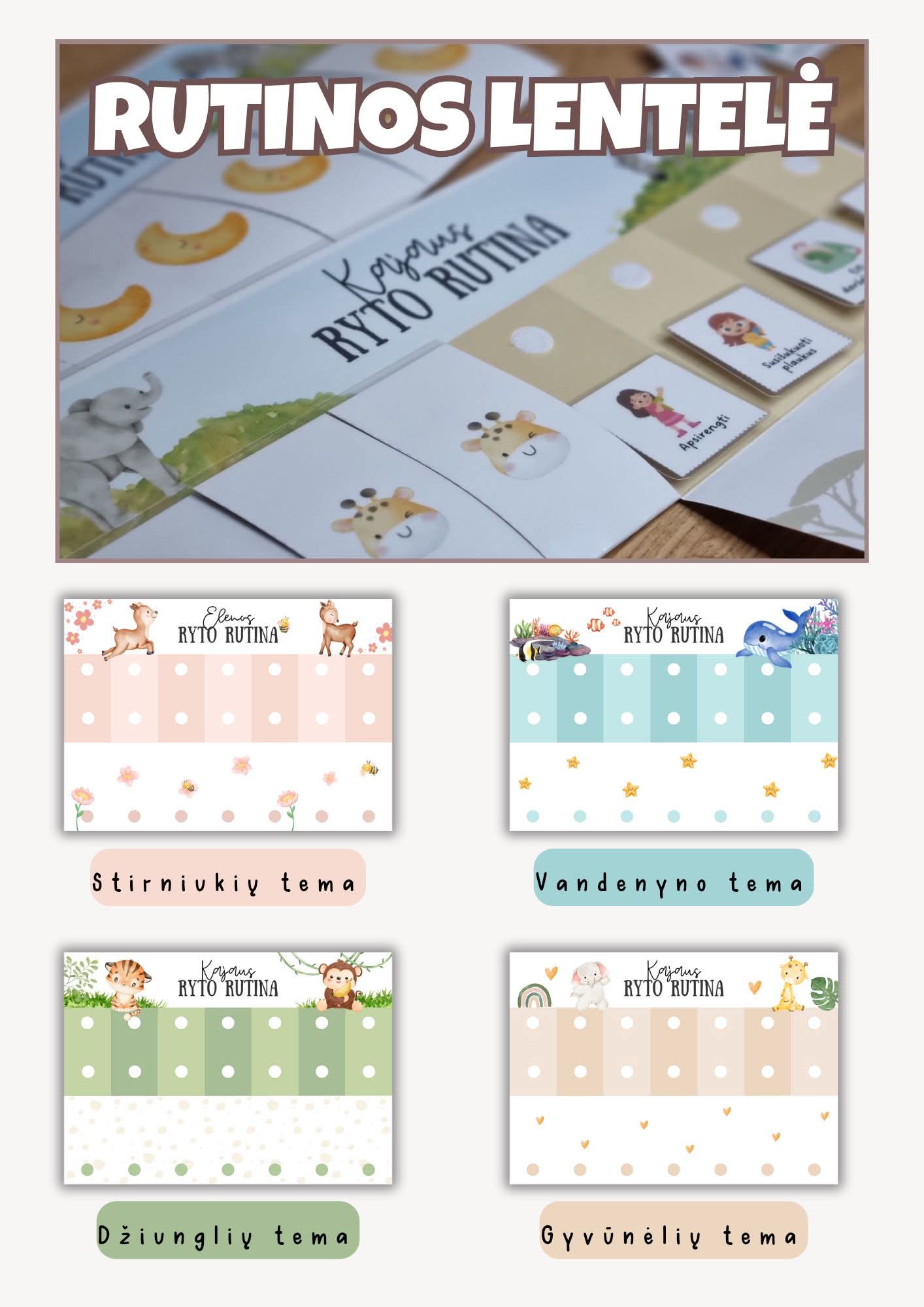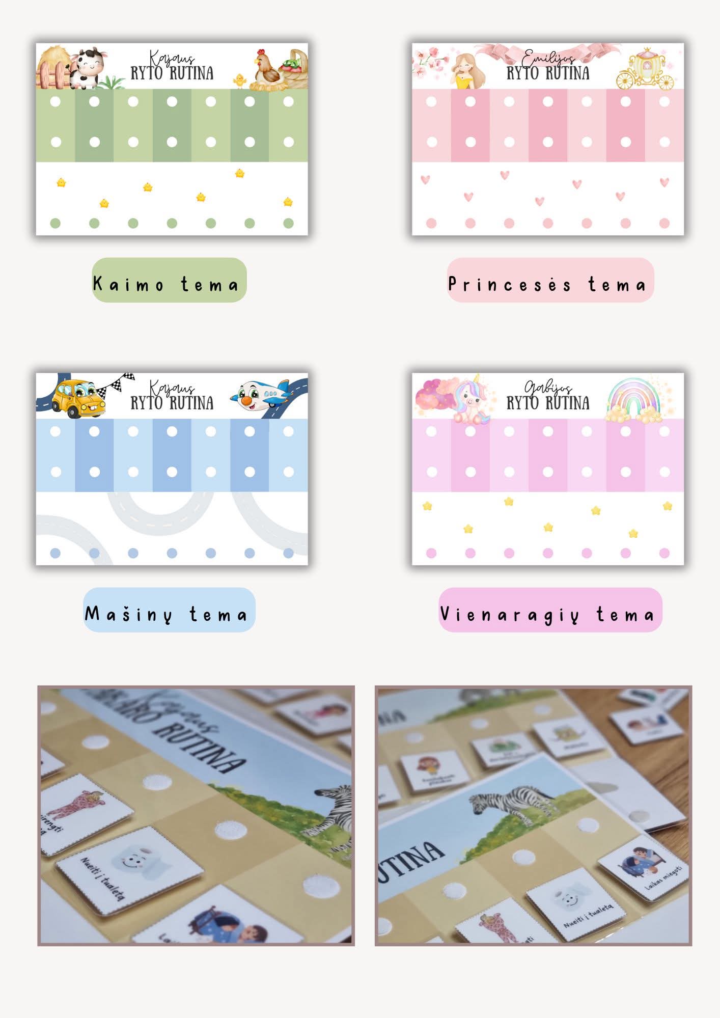 • 2 laminuotos A4 formato personalizuotos lentelės – ryto ir vakaro rutinai