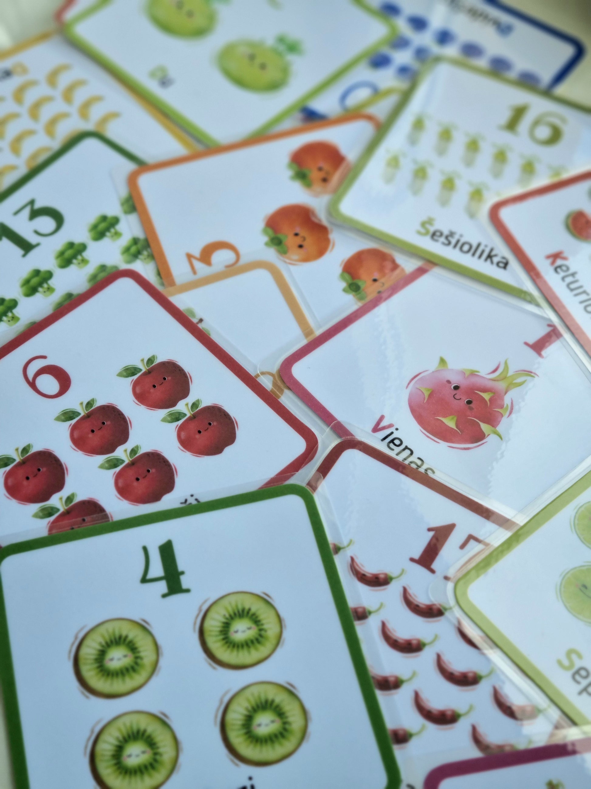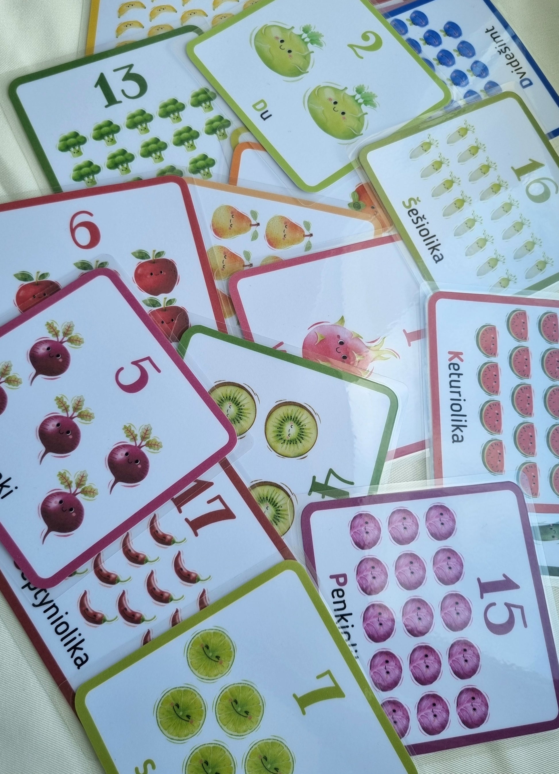 Laminuotos kortelės su vaisiais ir daržovėmis padės vaikams: