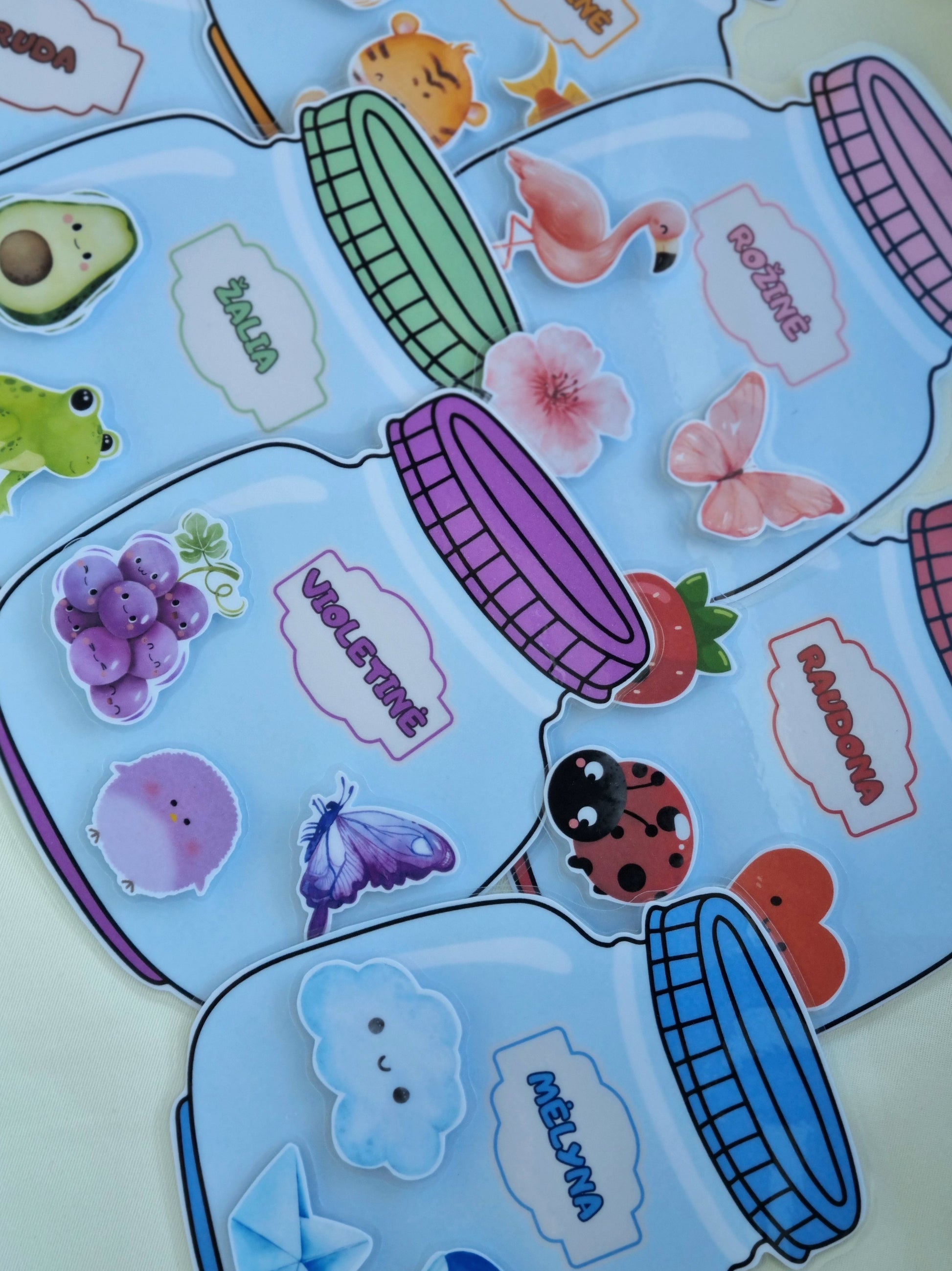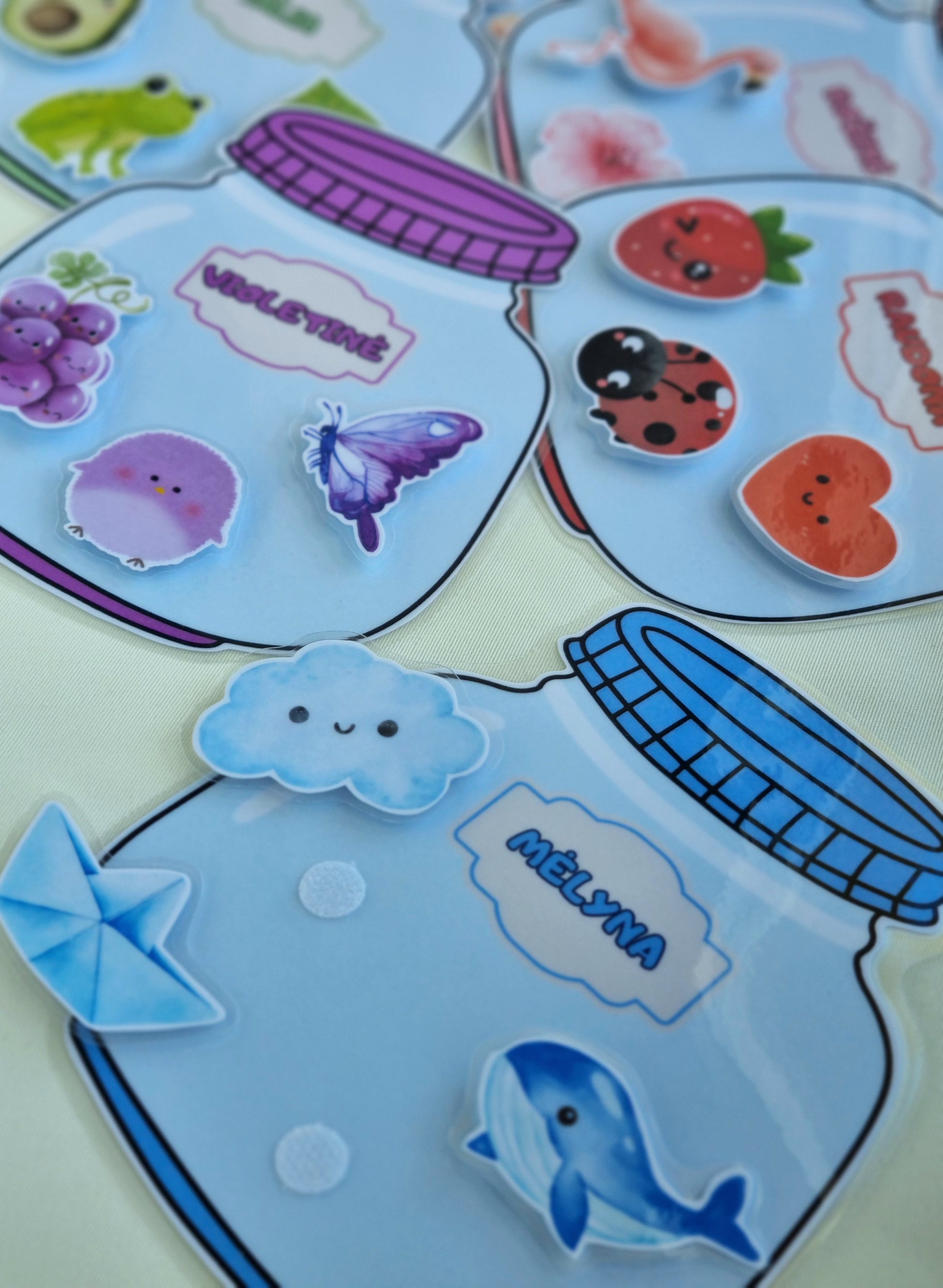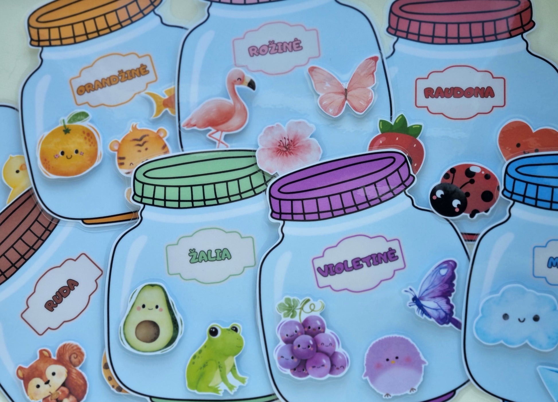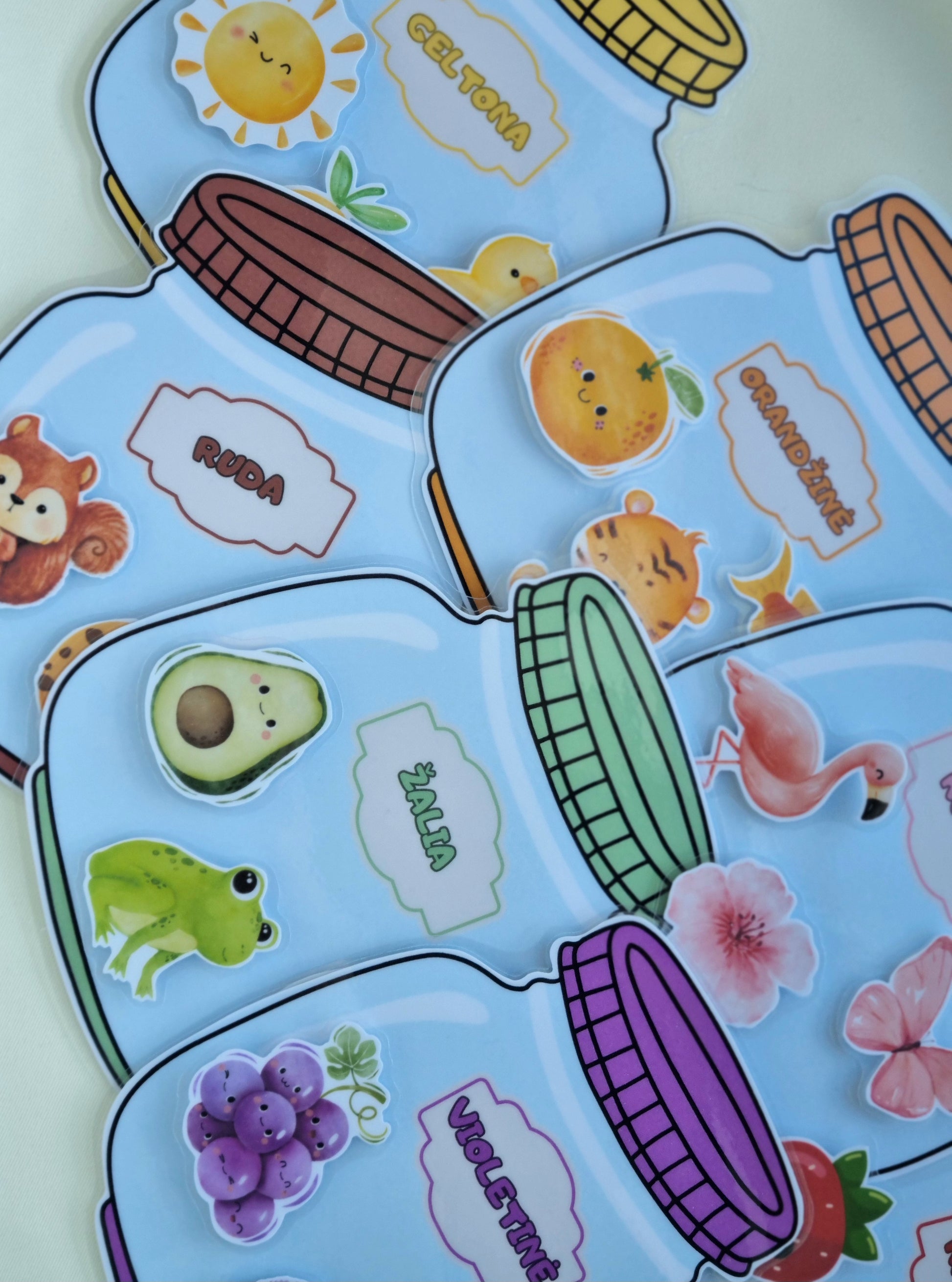 Vaikai rūšiuoja žaismingus objektus į 8 skirtingų spalvų stiklainius – geltonas saulutes, violetinius drugelius, raudonas braškes ir dar daugybę kitų!